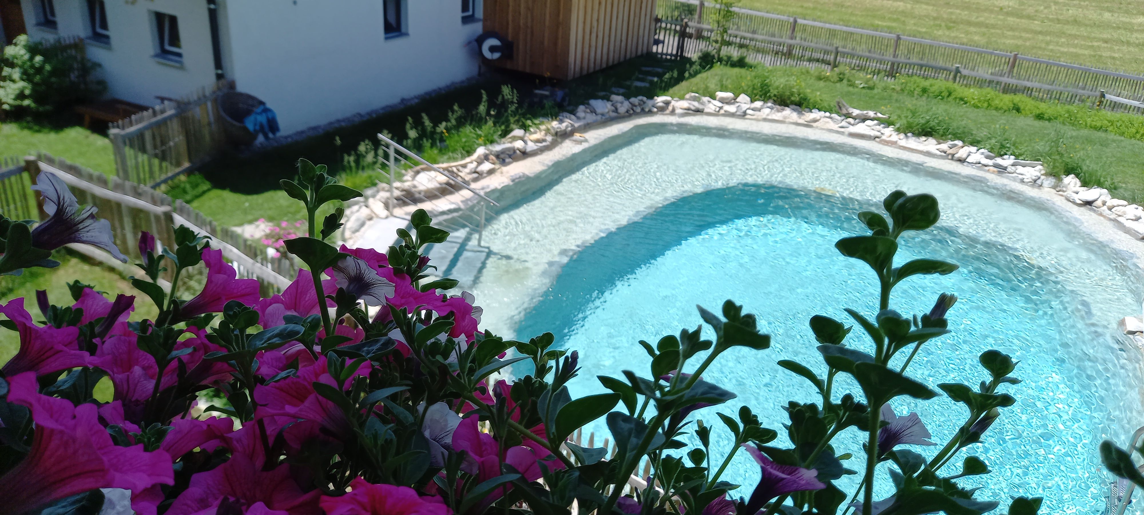 Wir bieten Ihnen einen türkis-blauen Naturbadeteich an. Darauf können Sie sich schon jetzt freuen.